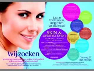 Op 3 oktober a.s. organiseren wij weer ons Skin & Lifestyle event. Een jaarlijks terugkomend event dat ieder jaar een ander thema heeft. Dit jaar staat in het teken van huidverbetering. Niet alleen voor mensen die kennis willen maken met het instituut, is deze dag. Ook voor dames en heren die al bekend zijn, is veel te beleven. Zo zijn er de hele dag acties en maakt iedere bezoeker kans op verschillende prijzen w.o. een producten en gratis behandelingen. Tevens is er een Decléor specialist aanwezig om je handen en armen heerlijk te verwennen, de huidtherapeut vertelt je alles over de behandelmogelijkheden m.b.t. littekens, overbeharing, striae en pigmentvlekken en Top make-up artist Bas Hokke van Youngblood Mirale make-up is aanwezig voor een touch-up. Voor slechts € 15,00 krijg je een persoonlijke uitleg en kun je in het half uur alles vragen wat je wilt weten over de mooiste make-up voor jou en jouw huid.