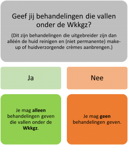 De beautybranche bevat verschillende beroepen. Binnen deze branche valt ook de schoonheidsspecialiste. Echter is daar ook een onderscheid in. Een groep die reguliere behandelingen geeft of huidverbeterende behandelingen. Omdat wij huidverbeterende behandelingen geven, veel investeren om ons bedrijf up to date te houden in kwaliteit, kennis en kunde, de juiste hygiëne maatregelen nemen en mede daarvoor ook aangesloten zijn bij ANBOS (brancheorganisatie), vallen wij onder de wet WKKGZ. Echter zijn er enkele behandelingen die niet onder de regeling vallen zoals de bodybehandelingen en kleine behandelingen zoals harsen en epileren. Uiteraard verzetten we deze graag met jou. We zullen contact met je opnemen, indien dit voor jouw ingeplande behandeling van toepassing is. Je mag ook contact met ons opnemen. (zie afbeelding)
