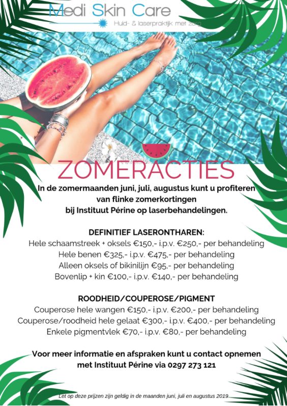 Profiteer vanaf zaterdag 8 juni van de zomeractie* bij onze huidtherapeuten van MediSkinCare. Heerlijk toch om niet meer zelf te ontharen of last te hebben van pigment en/of rode vlekjes!